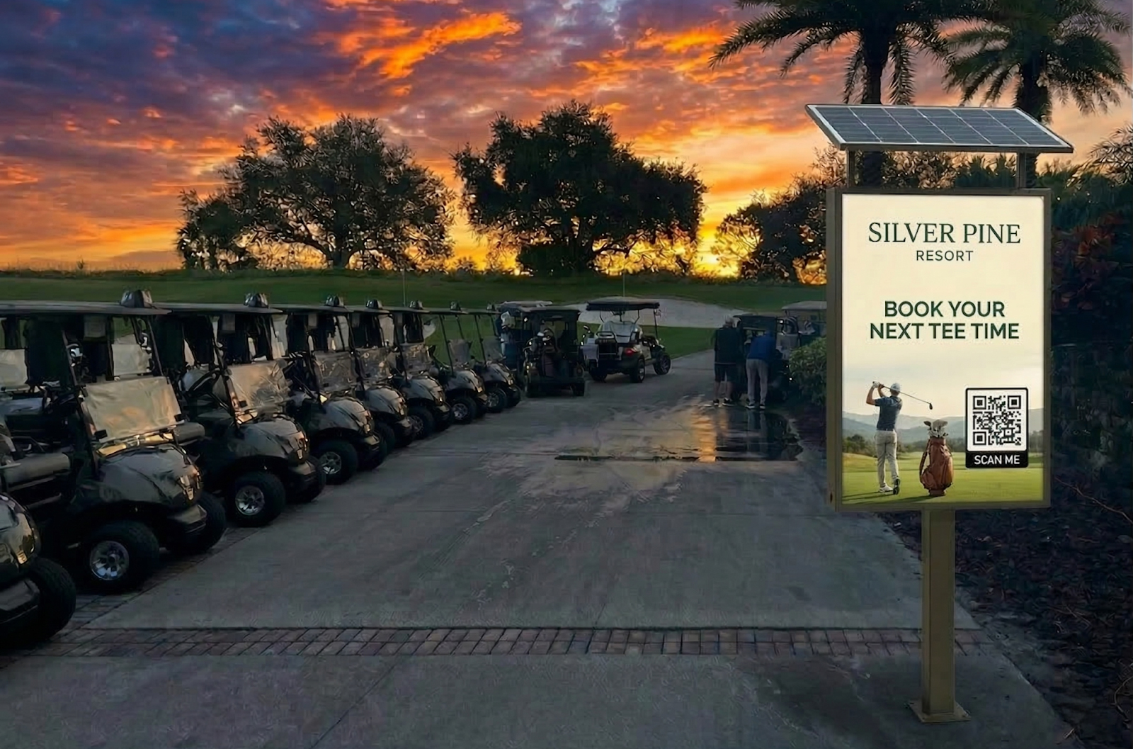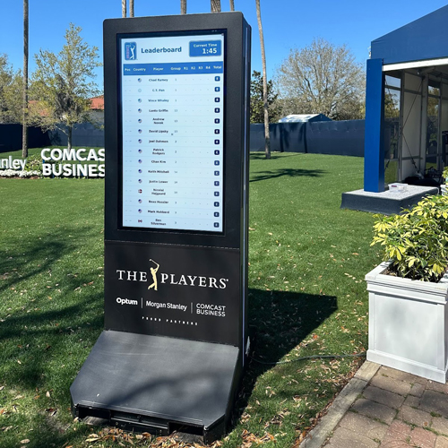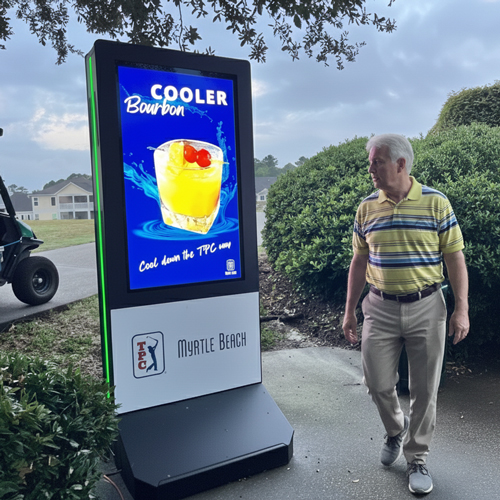 Our indoor and all-weather outdoor kiosks are engineered specifically for golf environments — portable, ruggedized, and tournament-grade. Battery-powered, cable-free options allow placement anywhere on the course without disruption.